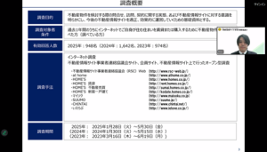 第44回不動産情報サイト事業者連絡協議会 研修会 2025.10.27 2025年10月24日午後4時より 「第44回不動産情報サイト事業者連絡協議会 研修会」を開催しました。 「不動産情報サイト利用者意識アンケート」調査結果報告として、 講師:(株)LIFULL 飯島 慎太郎氏より報告いたしました。 « 第93回不動産情報サイト事業者連絡協議会 定例会 | 【メイン】 | 2025年版「不動産情報サイト利用者意識アンケート」 調査結果リリース »